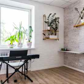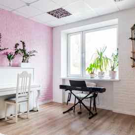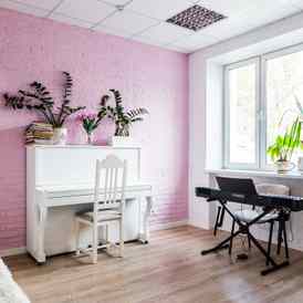 В распоряжении учеников большой музыкальный комплекс из трех этажей в самом сердце Минска с яркими и светлыми помещениями и большими витражными окнами.